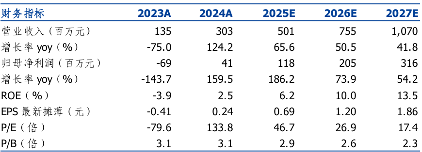 公司在 2025 年上半年实现了营收和利润的大幅增长,各业务板块协同发展,市场竞争力不断增强。考虑到半导体行业的持续向好趋势以及公司在行业中的优势地位,预估公司 2025-2027 年归母净利润为1.18 亿元、2.05亿元、3.16亿元,同比增长186%、74%、54%。
