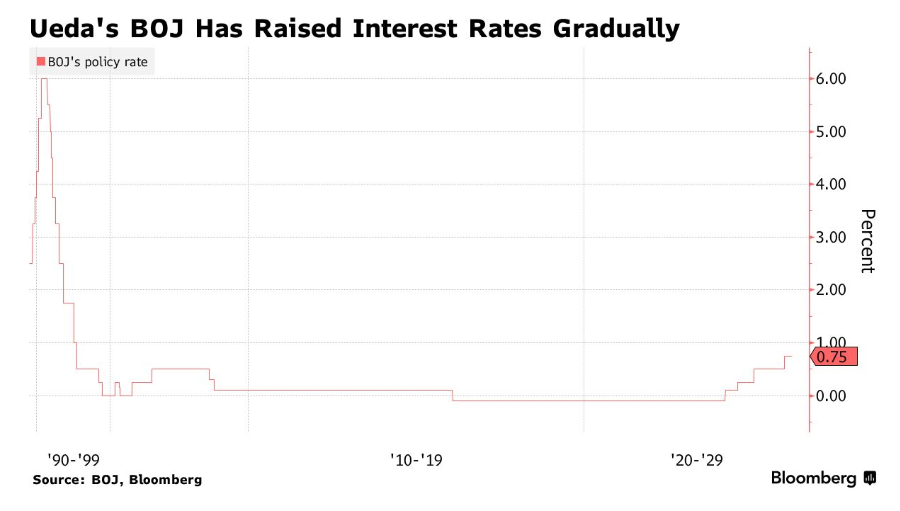 根据一份最新声明,日本央行在周四为期两天的会议结束时,将基准利率维持在0.75%不变。这一结果符合经济学家们一致预期。日本央行以8比1的投票结果作出这一决定,其中鹰派代表人物高田创连续两次会议投下反对票,主张加息。声明发布后,日经225指数扩大跌幅,而日元则无重大变动。