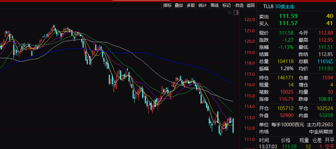 今日午后,国债期货持续走弱,30年期主力合约盘中跌1.10%,10年期跌0.26%,5年期跌0.19%,2年期跌0.07%。国债期货收盘全线下跌,30年期主力合约跌0.91%报111.820元,10年期主力合约跌0.28%报107.975元。不单是国内国债走势不行,日本国债和美国国债亦是全线杀跌。