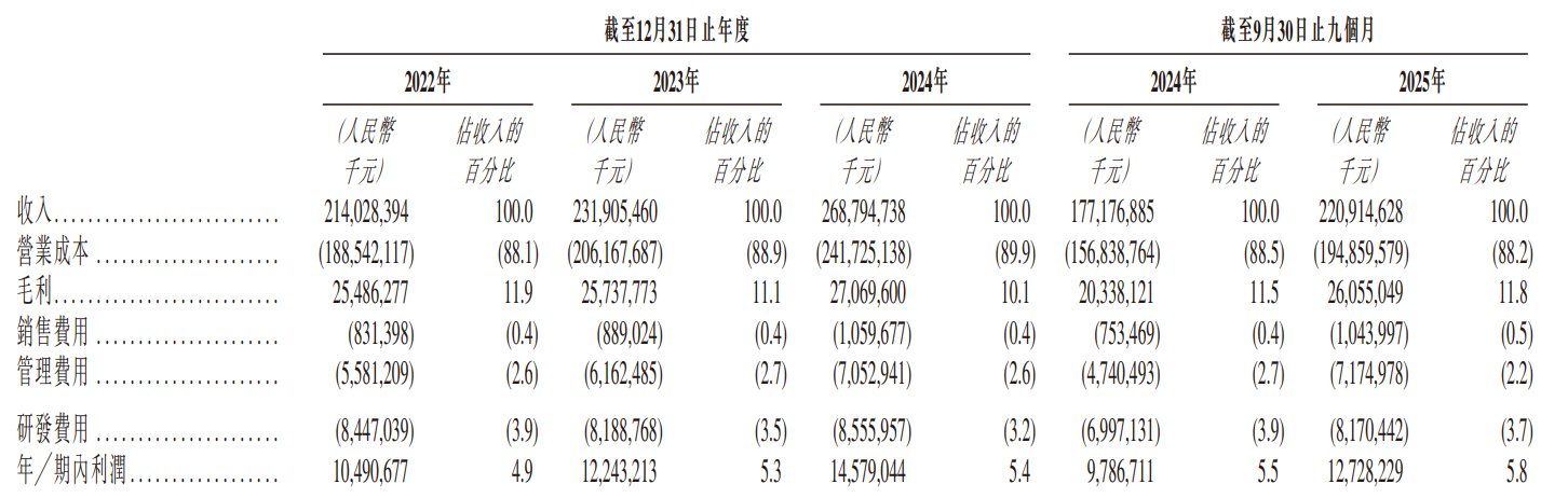 于2023年、2024年及2025年截至9月30日止九个月,该公司毛利率分别为11.1%、10.1%、11.8%。