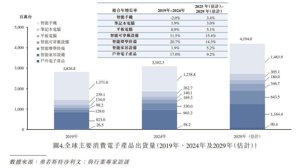 得益于对AI技术需求的增长,2024年智能可穿戴设备(包括AI眼镜/XR设备、智能手表及智能手环)整体出货量超过1.69亿台,同比大幅增长。受惠于AI、物联网等技术与新兴消费电子产品的深度融合,智能声学终端、智能家居设备、户外电子凭借功能拓展、交互体验升级、互联互通、智能化功能增强等优势,展现了较强的发展潜力。2024年,智能声学终端、智能家居设备、户外电子等产品的出货量分别达到3.30亿台、9.03亿台和0.58亿台。预计创新的消费电子产品设计与AI应用的整合将推动该等产品的进一步换代。