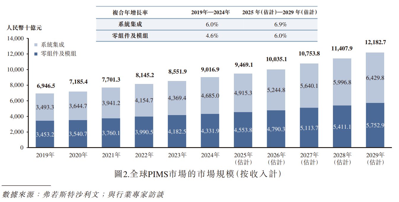 根据2024年全球收入市场份额,集团位列全球PIMS提供商第4位,在总部位于中国大陆的企业中排名最高。在全球PIMS市场中,于2024年的前五大厂商分别为A公司、B公司、HH公司、本集团和C公司,所占市场份额分别为17.1%、5.0%、3.5%、3.0%和2.8%。
