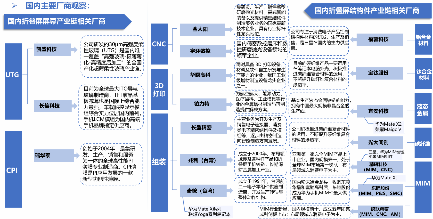 折叠屏产业链相关公司包括立讯精密(总装2027年加入),蓝思科技(UTG)、凯盛科技(UTG)、捷邦科技(赛诺高德),精研科技(MIM),舜宇和蓝思科技(MetaLens),信维通信与领益科技(钢壳电池),联赢激光(钢壳电池焊接设备)。