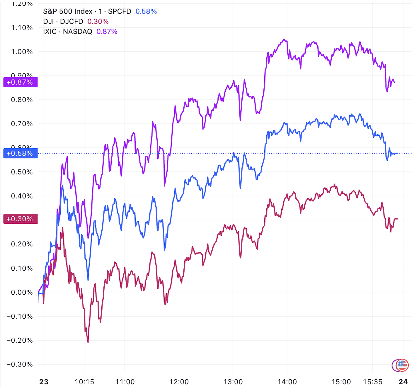 截至收盘,道琼斯指数涨0.31%,报46,734.61点;标普500指数涨0.58%,报6,738.44点;纳斯达克指数涨0.89%,报22,941.80点。