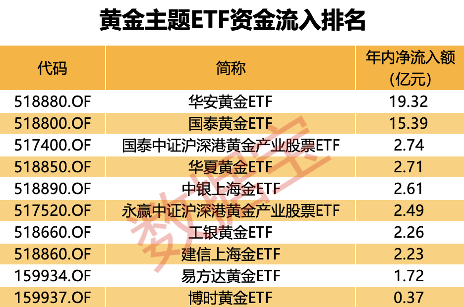 黄金主题ETF较好的“赚钱效应”吸引了大量投资者涌入。数据显示,20只黄金主题ETF年内合计净流入额达49.5亿元,华安黄金ETF、国泰黄金ETF两只基金累计吸金均超过15亿元。