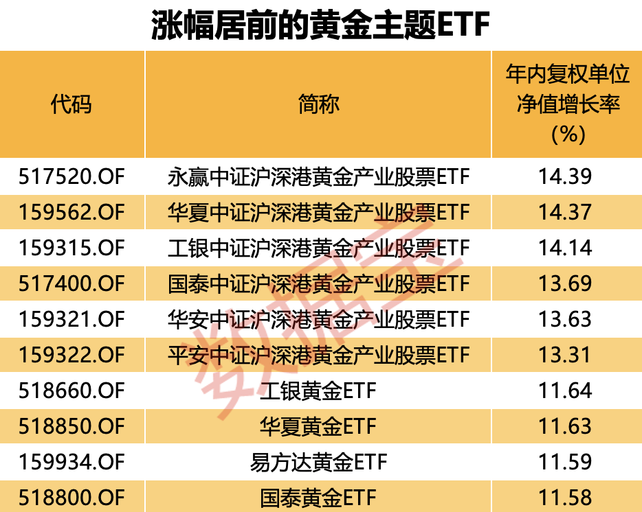 具体来看,永赢中证沪深港黄金产业股票ETF年内净值涨幅达14.39%居首,其前十大重仓股分别为山东黄金A/H股、紫金矿业A/H股、中金黄金等,其中H股招金矿业年内累计大涨超30%,赤峰黄金、山东黄金H股均大涨超27%。