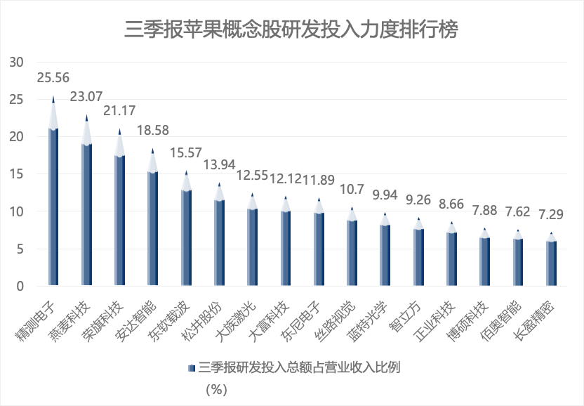 拉长来看,2021年至2023年,燕麦科技的研发支出占比均超20%,2023年研发支出占比超过27%,高居苹果概念股行业前列。今年前三季度研发投入仍居于果链概念股第二。