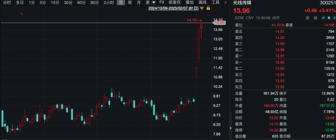 2月5日,光线传媒股价涨停,当日成交额达到23.01亿元。从2月5日以来,光线传媒股价涨幅达到46.48%。