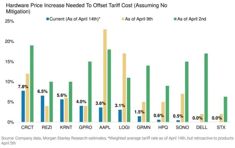 具体到苹果,大摩认为,该公司的年化关税成本负担目前为70亿美元,较上周四时的440亿美元更为“可控”,仅占该公司息税前利润的5%。此外,有报道指出,截至今年3月的12个月里,苹果在印度的iPhone产量增长了60%。该行的调查也显示,苹果在原定的4月11日截止日期之前提前准备了数百万部iPhone库存。该行认为,1)苹果面临的短期关税成本负担可能相对较小;2)中期而言,苹果可能不必提高同类iPhone产品的价格,而是可以通过提高在印度的生产比例、向供应商施压共担成本、淘汰低存储容量SKU、并通过与运营商/以旧换新合作伙伴合作使设备更便宜。