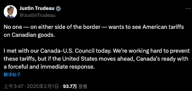 在白宫发表最新威胁后,加拿大总理特鲁多表态称,没有人希望看到美国对加拿大商品征收关税。但如果美国继续推进,加拿大已准备好采取强有力和立即的回应。