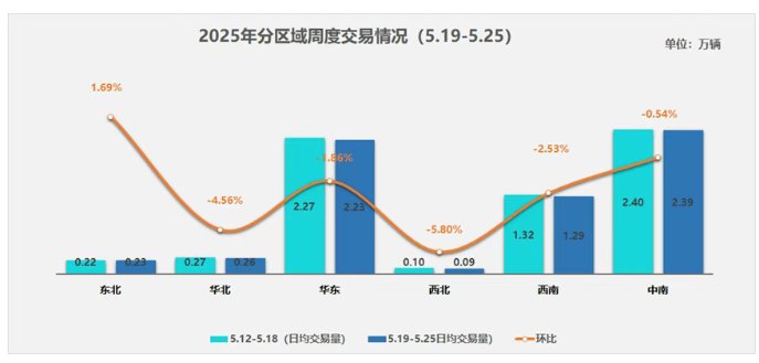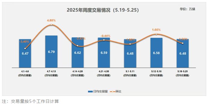 中国汽车流通协会发文称,2025年5月19日至25日,二手车日均交易量为6.48万辆,环比下降1.56%,同比4月同期下降1.6%,市场淡季特征明显。