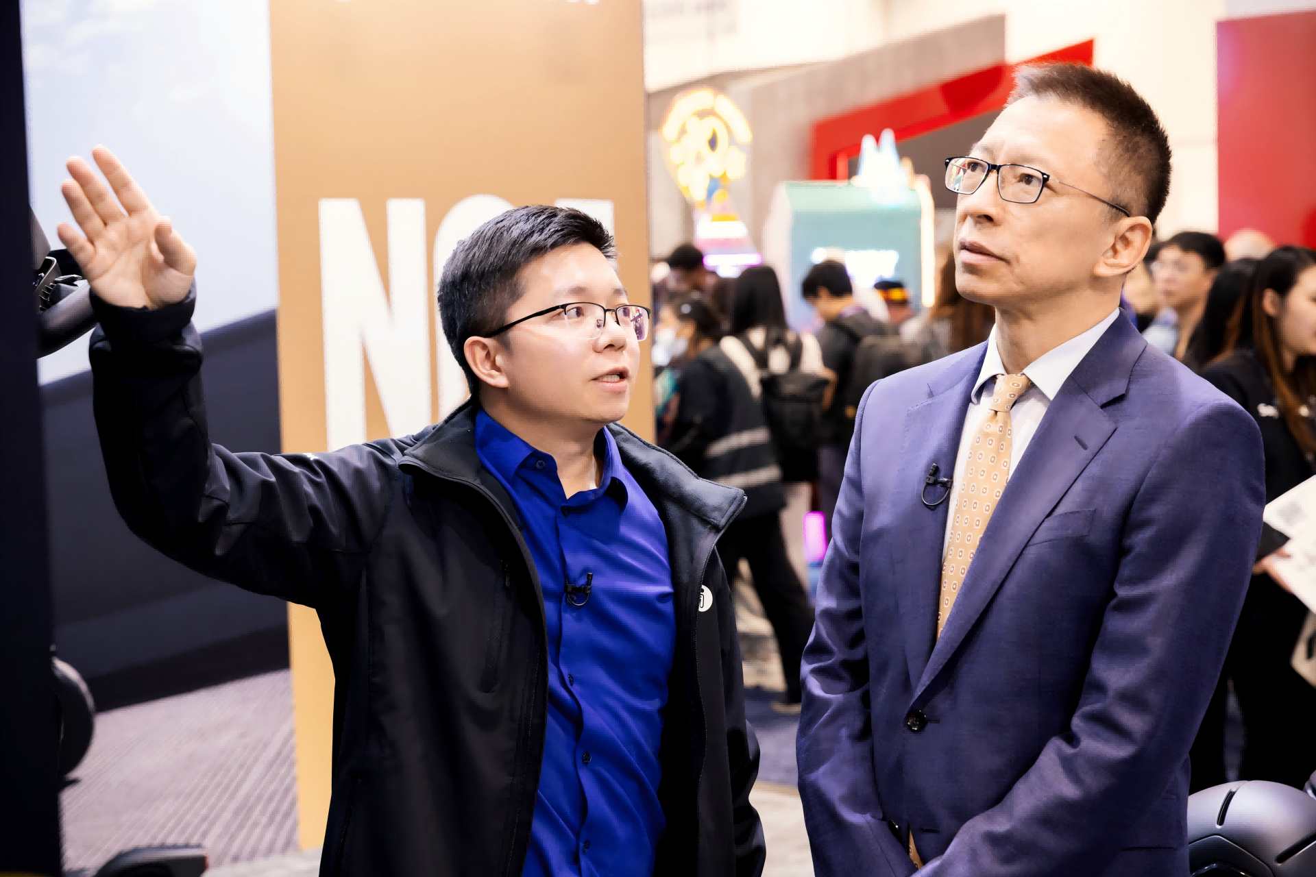 图为:九号公司总裁陈中元(左)与张朝阳(右)参观九号公司展位