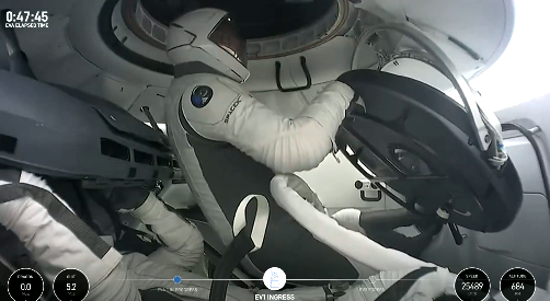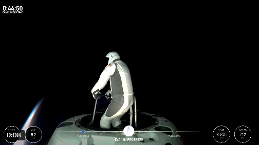 他借助被SpaceX命名为“天行者”的扶手,小心翼翼地通过“龙”飞船顶部的舱门。为了安全起见,他始终保持一只手或脚停留在飞船外壁类似梯子的支撑结构上,还有一根3.6米长的安全绳将他与飞船相连,且不同于以往宇航员飘出国际空间站相当距离的太空行走,艾萨克曼并没有在绳子末端悬停,只是探出了大半个身子,在船首附近有限活动,而非整个身体出舱,其出舱时间只有短短的10分钟。