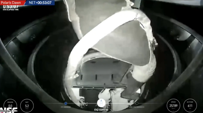 这次出舱活动在距离地球表面约700公里的高度进行,由艾萨克曼和执行“北极星黎明”航天任务的另一名女性宇航员莎拉•吉利斯轮流出舱,两人分别用时15-20分钟,其中,吉利斯的出舱时间不到10分钟。