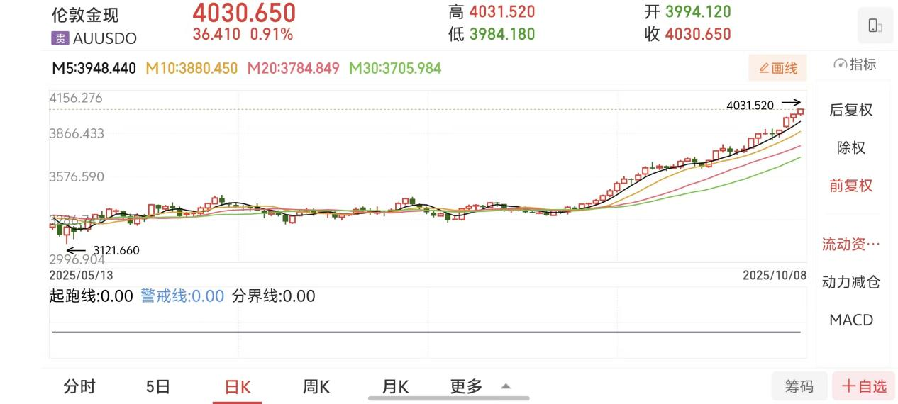 10月8日,现货黄金突破每盎司4000美元大关,续创新高,截至记者发稿,现货黄金一度高达4031.52美元,年内黄金涨幅高达53.57%;现货白银每盎司48.84美元,创2011年5月份以来新高,距历史高位即2011年4月的49.77美元/盎司仅一步之遥。