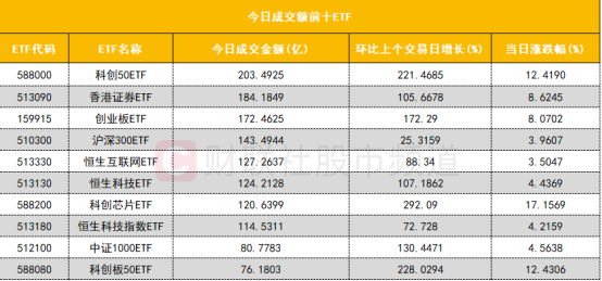 从成交额前十的ETF来看,科创50ETF(58800)成交额成交额位居首位,成交超200亿;香港证券ETF(513090)成交额位居第二位。