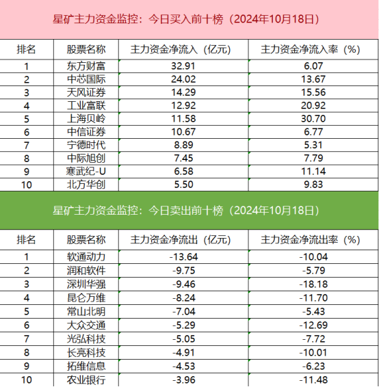 从个股主力资金监控数据来看,主力资金净流入前十的个股中芯片和券商股较多,东方财富净流入居首。