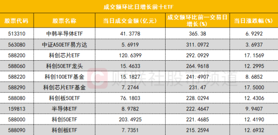 从成交额环比增长前十的ETF来看,多只芯片和科创板ETF位居前十行列,其中中韩半导体ETF(513310)成交额环比增长365%位居首位。