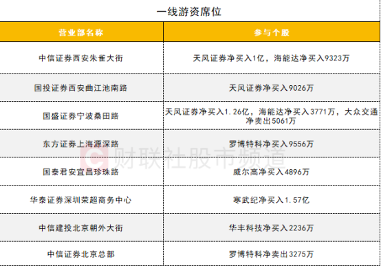 一线游资活跃度一般,天风证券获三家一线游资席位买入,其中国盛证券宁波桑田路营业部买入1.26亿;寒武纪获华泰证券深圳荣超商务中心营业部买入1.57亿。
