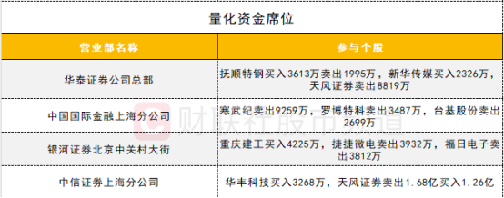 量化资金活跃度明显提升,天风证券遭一家量化席位卖出超8000万同时遭一家量化席位做T;寒武纪遭一家量化席位卖出超9000万。