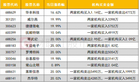 卖出方面,多只涨停的科创板个股遭机构卖出,其中芯片股寒武纪遭机构卖出2.95亿同时获机构买入2.09亿,CPO概念股生益电子遭机构卖出1.82亿,低空经济概念股莱斯信息遭机构卖出超5000万;鸿蒙概念股常山北明遭机构卖出2.04亿。