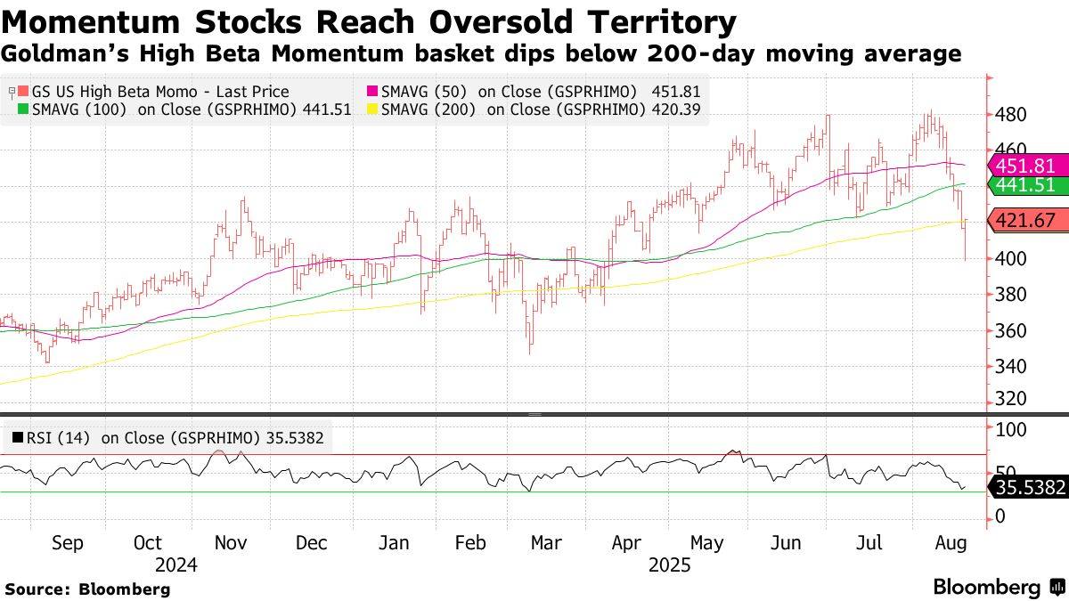 交易员们还分析了技术图表,以寻找动量交易抛售可能止步的线索。一篮子动量股票正接近超卖区域,并逼近所谓回归通道的底部(即现有趋势的下边界)。同时,该篮子股票也跌破了200日移动均线,这一水平可能成为重要支撑。
