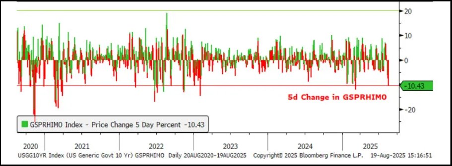 动量策略的重点是买入近期上涨的个股,卖空表现落后的个股。这一策略的突然回撤源于该篮子中被做空股票的反弹。不过,高盛的交易员表示,一篮子动量股票在本周的下跌更多是由被做多的股票的下跌推动的,“因为人工智能等主题股在这轮轮动中遭受打击”。数据显示,高盛的一篮子动量股票在8月6日至8月19日之间下跌了13%,此前曾接近历史高点。