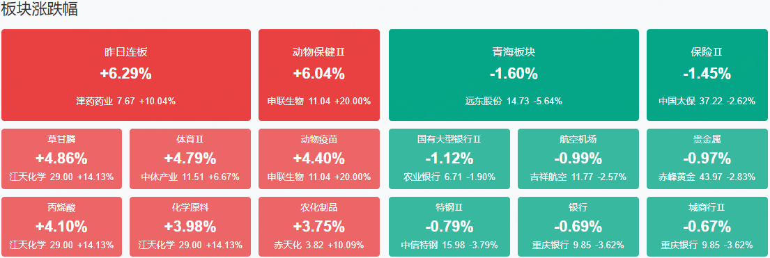 板块方面,农药化肥、化工、PCB、算力芯片等板块表现活跃,保险、银行、贵金属等板块表现落后。截至收盘,沪指涨0.03%,深成指跌0.2%,创业板指跌0.46%。