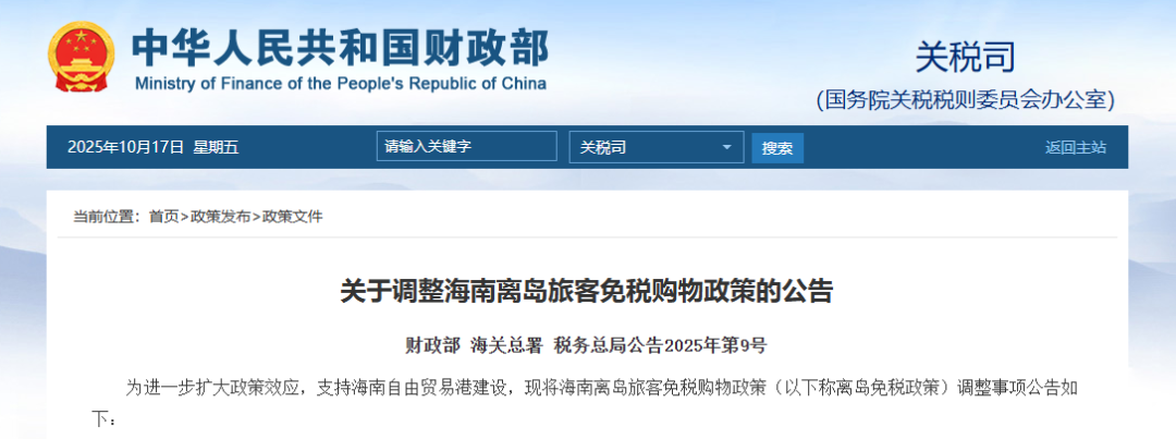 10月17日,财政部、海关总署、税务总局联合印发公告,调整海南离岛旅客免税购物政策,并定于11月1日起实施。