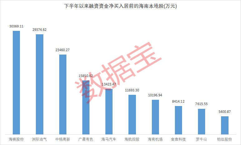 据证券时报·数据宝统计,下半年以来(截至10月16日),融资资金净买入额超过5000万元的海南本地股有10只,海峡股份、洲际油气、中钨高新排名前三,对应金额依次为3.04亿元、2.94亿元、2.35亿元;广晟有色、海马汽车、海航控股、海南机场融资净买入额也在1亿元以上。