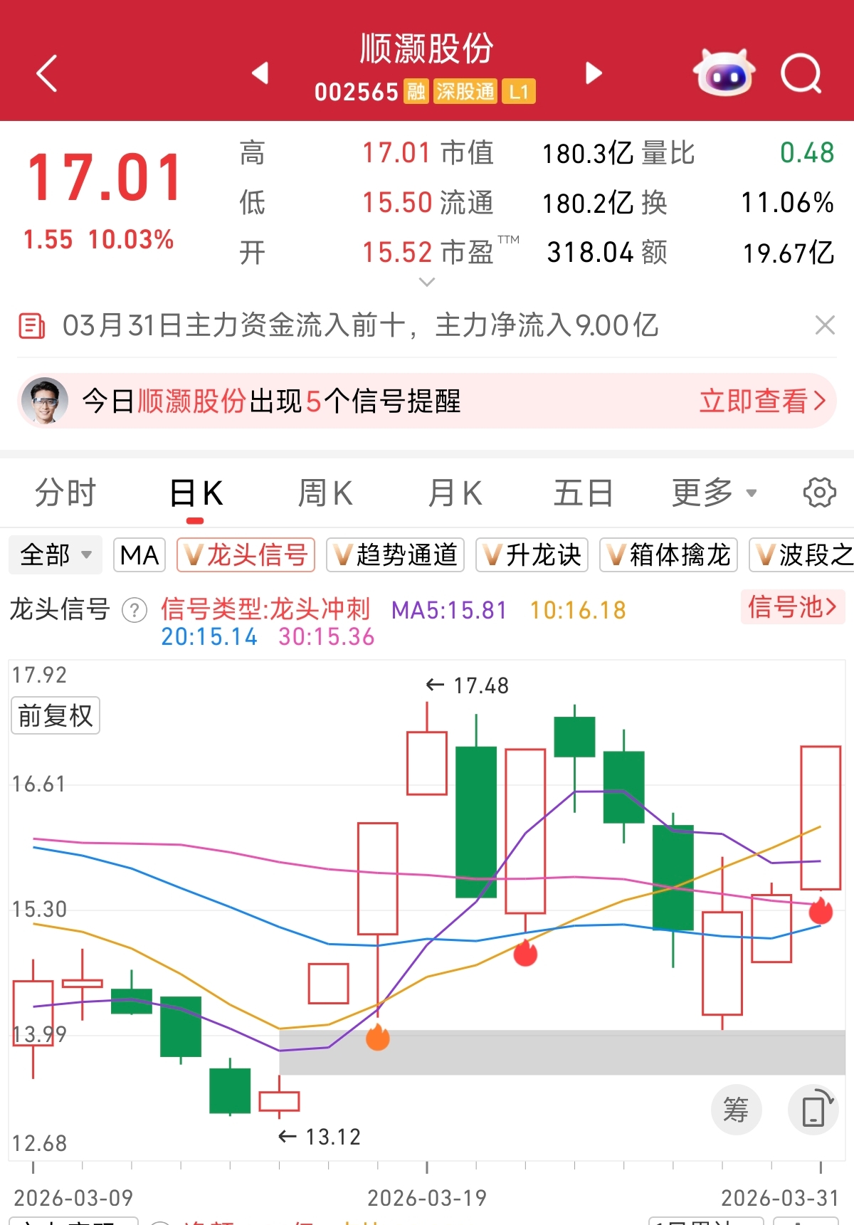 根据龙头信号监控,近日上涨的顺灏股份,在3月31日出现龙头冲刺信号,感兴趣的朋友可以自行跟踪判断。