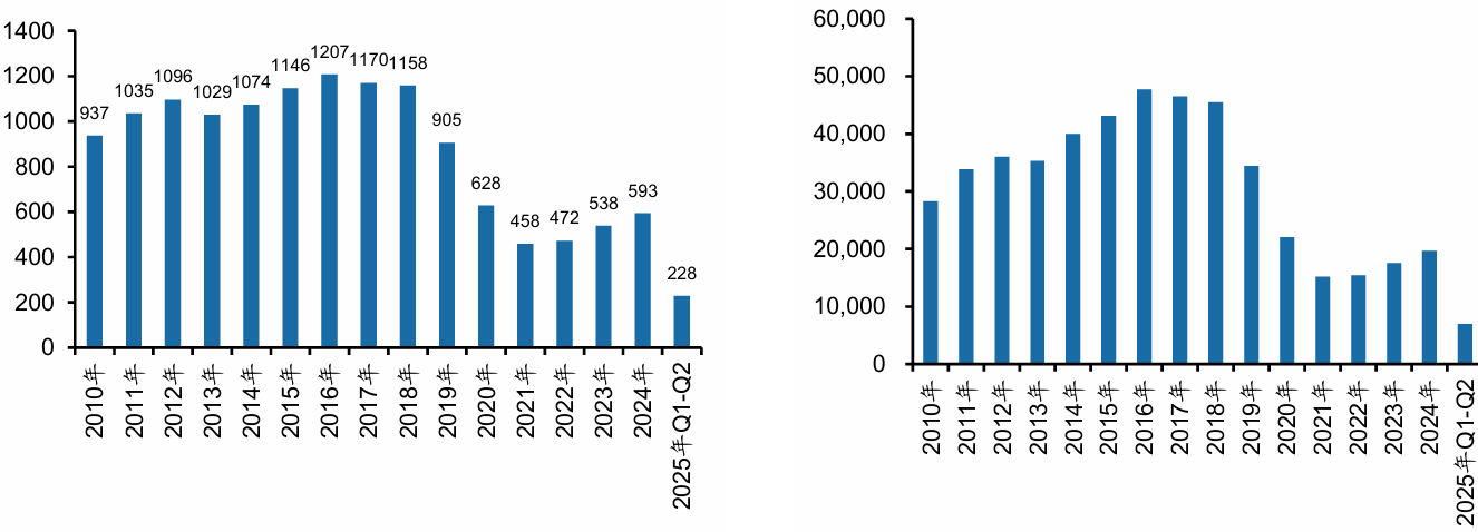 图:全国拍摄制作电视剧备案情况(2010-2024年,25Q1-Q2)部数、集数 |