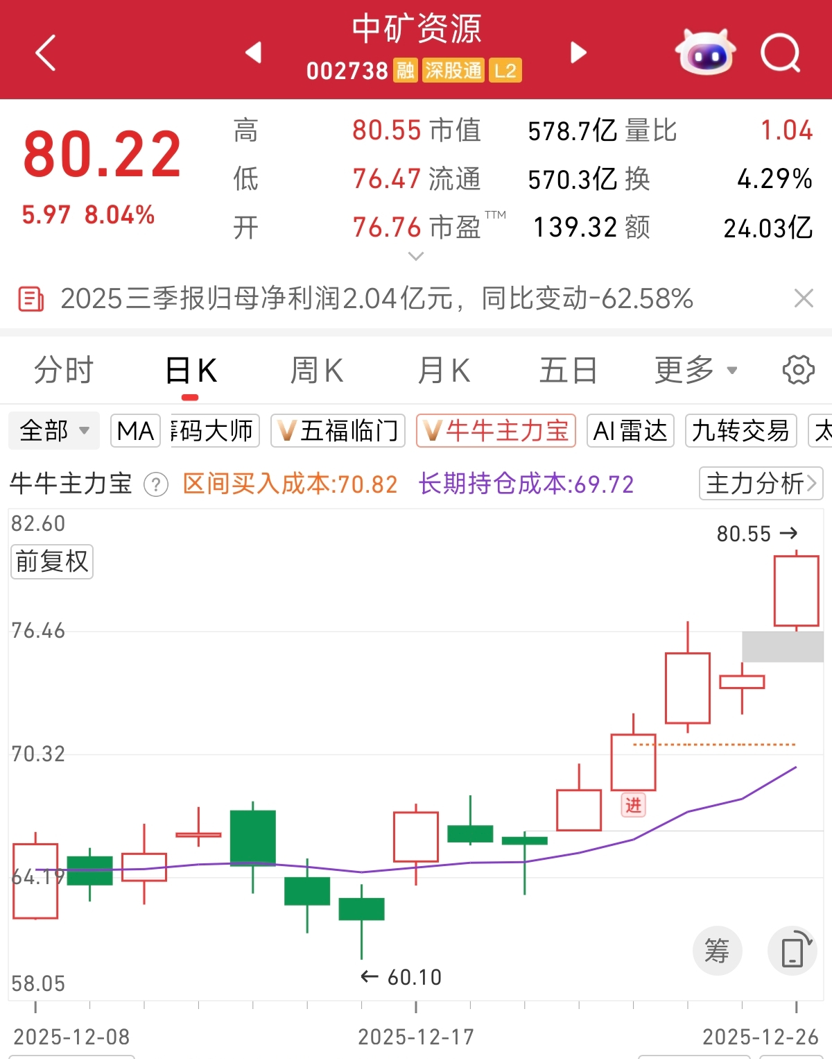 根据“主力宝”监控,今日大涨的中矿资源,主力在12月23日进场,仅仅三个交易日,已经上涨17%。