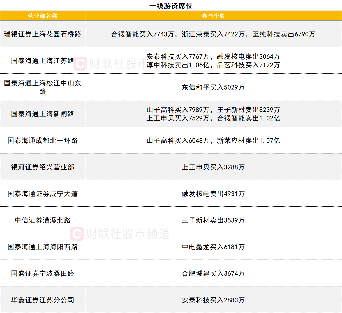 一线游资活跃度较高,至纯科技遭一家一线游资席位卖出6790万。上工申贝获两家一线游资席位买入1.08亿。合锻智能获一家一线游资席位买入7743万,同时遭另一家一线游资席位卖出1.02亿。