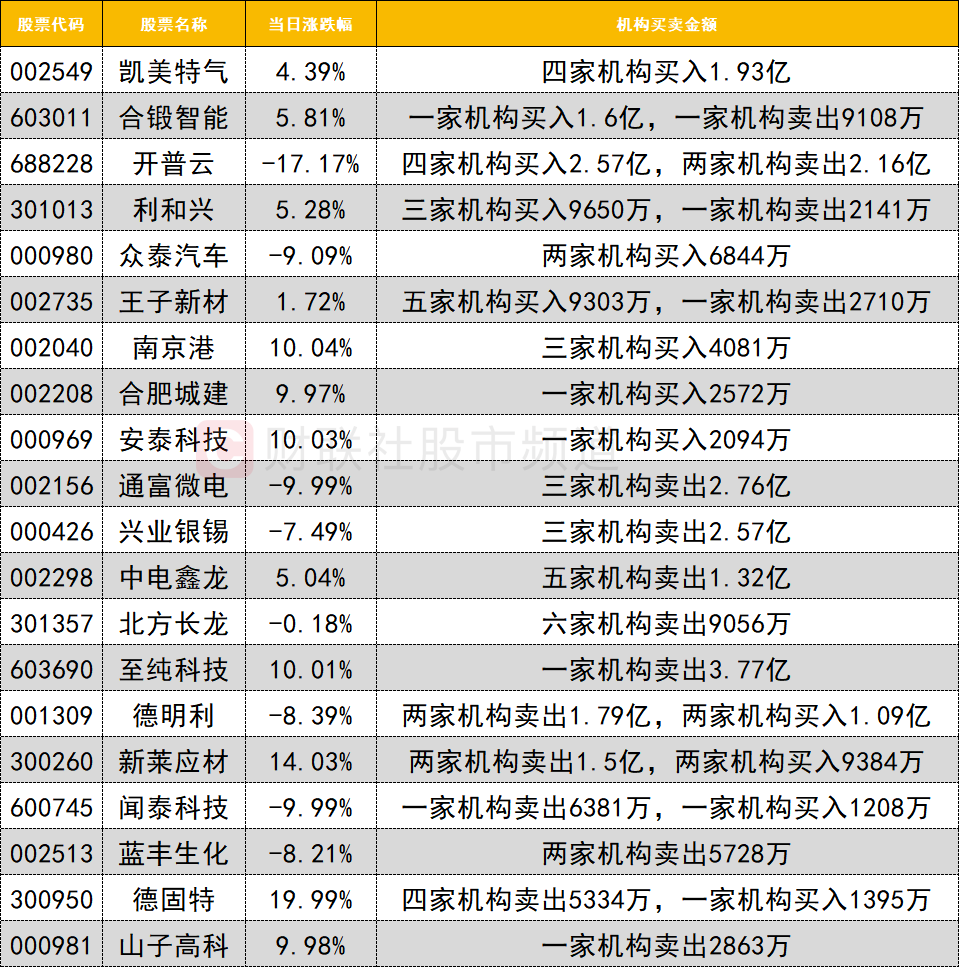 卖出方面,芯片股通富微电遭三家机构卖出2.76亿,德明利遭两家机构卖出1.79亿,新莱应材遭两家机构卖出1.5亿,同时获两家机构买入9384万。涨停的至纯科技遭一家机构卖出3.77亿。