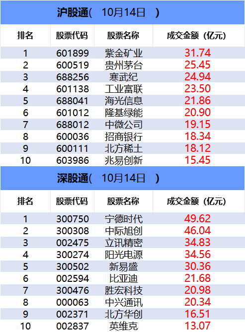从沪股通前十大成交个股来看,紫金矿业位居首位;贵州茅台和寒武纪分居二、三位。