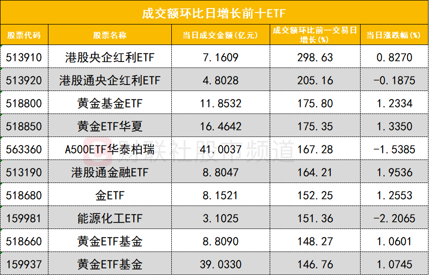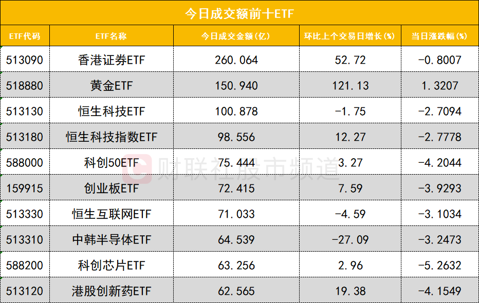从成交额前十的ETF来看,香港证券ETF(513090)成交额位居首位,黄金ETF(518880)成交额位居次席。