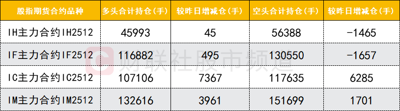 四大期指主力合约中,IC、IM合约多空双方均加仓,IM期指主力合约多头加仓近4000手,较空头多加仓超2000手。
