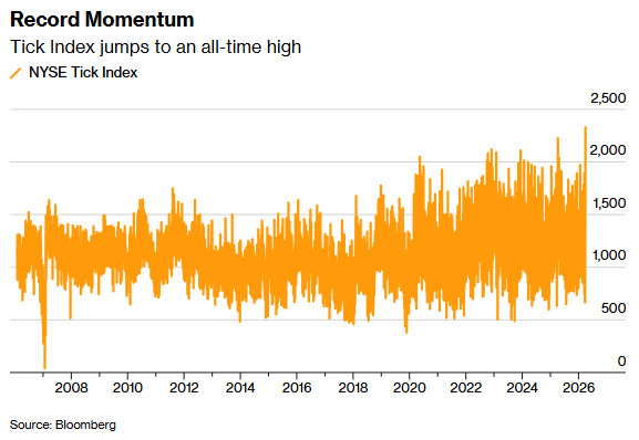 衡量投资者旺盛买盘需求的一个指标是Tick Index,该指数以秒为单位衡量纽约证券交易所上涨股票数量与下跌股票数量之比。周二,该指数飙升至2329,创历史新高。
