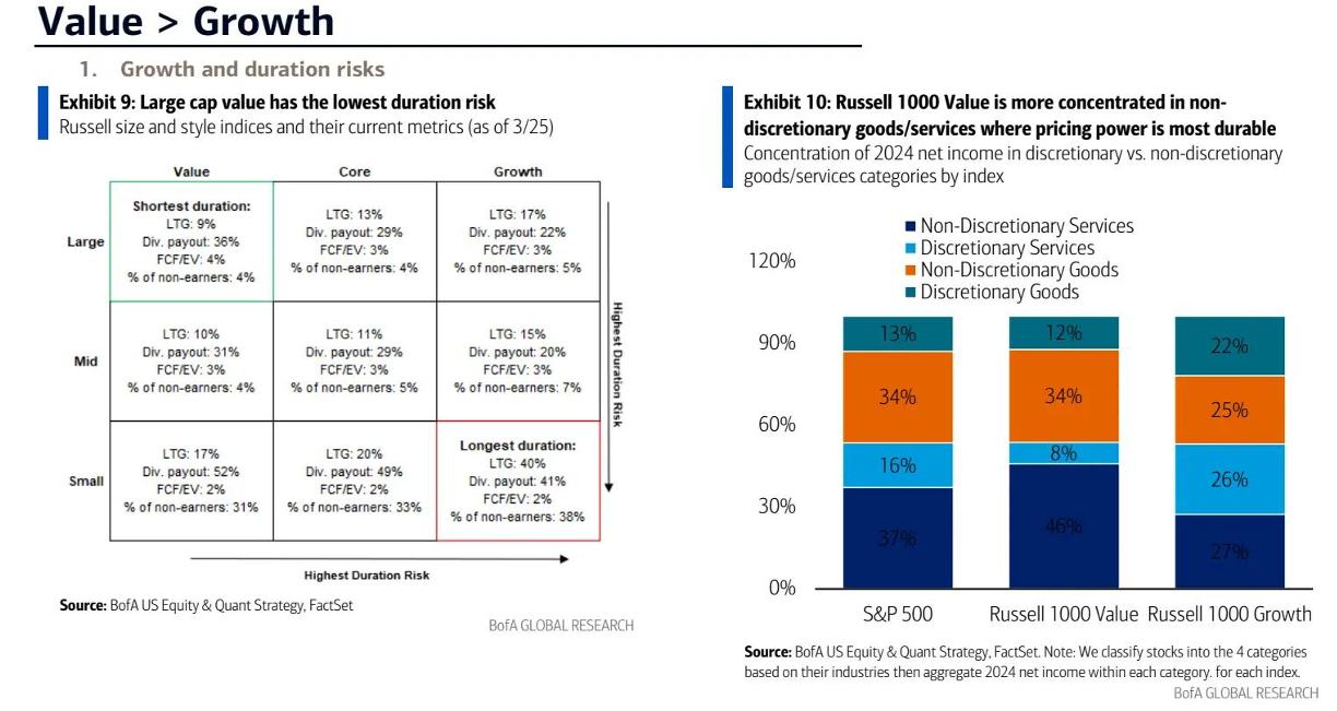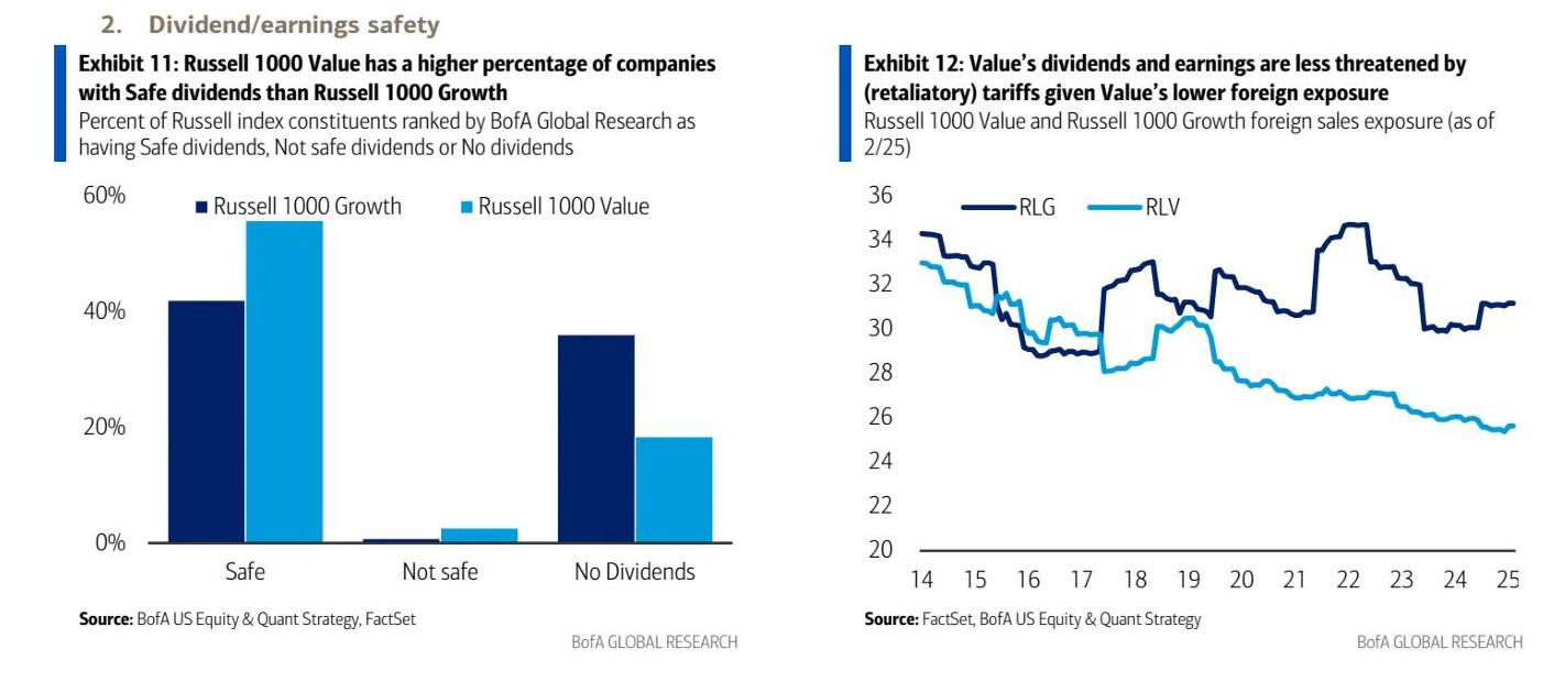 与此同时,在当前的信用周期以及周期指示器所暗示的“下行期”,美银汇编的量化指标显示,以“股息安全性”来衡量的企业健康状况指标优于以往经济下行期,并且美股“价值指数”的整体表现优于“成长指数”。