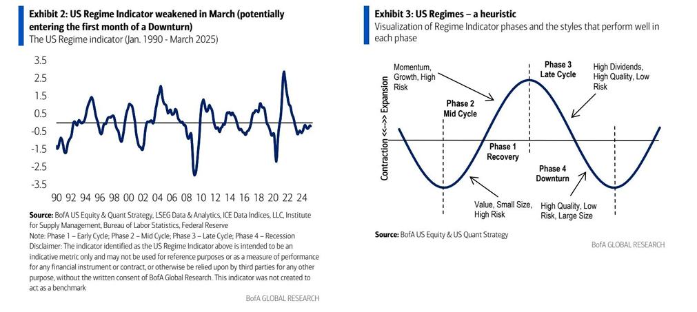 美国银行所统计的“美国周期指示器”指标显示,美国经济基本面已从“上升期”转向“下行期”的第一个月。这究竟是短暂摇摆还是阶段性的转换?自2022年2月以来,该指示器指标就在两种阶段之间反复切换——这是一种宏观层面的经济信号动荡,且库存与需求双向“鞭打”:先是新冠疫情之后引发的持续剧烈波动,如今又因抢跑关税定价而反复波动。