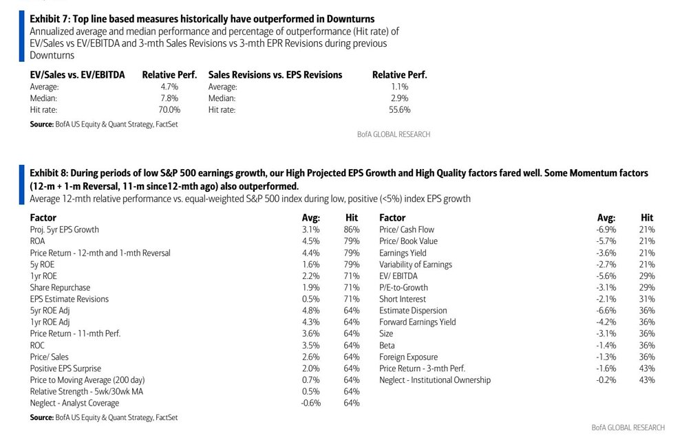 美银策略团队当前愈发偏好“估值便宜且销售额增长为正”的股票类型,并且研究发现基于“销售额”的估值与修正指标在先前的经济下行期往往跑赢基于盈利(即每股收益EPS)的指标。原因何在?美银策略师团队表示,主要逻辑在于可选择的消费品需求在经济下行期显著下滑,销量减少,销售额增长处于稀缺状态。一般来说,通过削减成本更易维持强劲的利润率,而下行期若要实现销售额超预期增长,则需具备“强大的定价权”能力——美银策略师们汇编的分析数据显示,这种能力在“必需消费板块”可谓最明显。