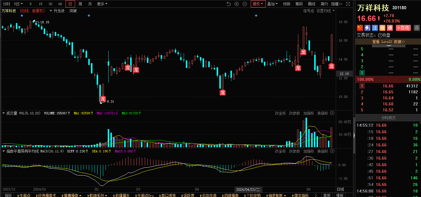3)参考技术指标:万祥科技-升龙诀指标-出现龙信号