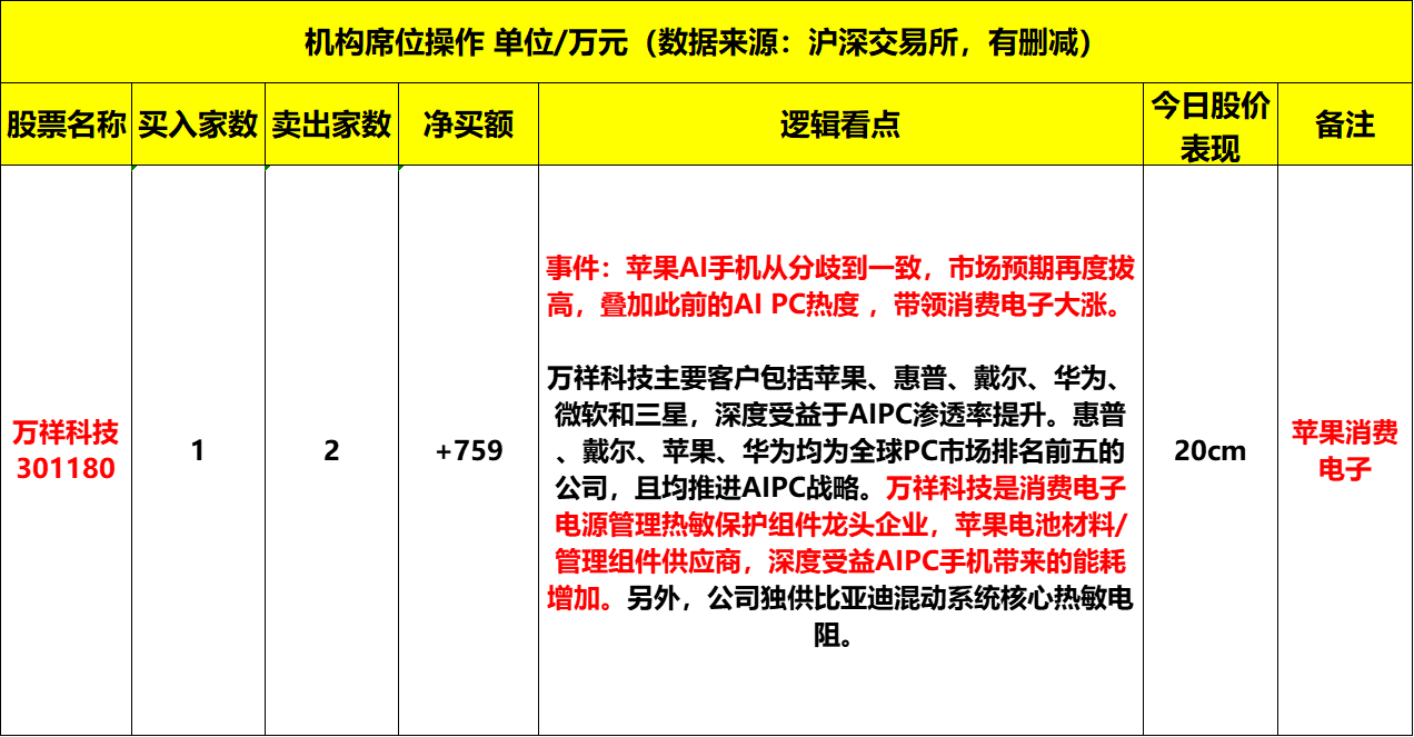 1)核心逻辑:苹果AI手机从分歧到一致,市场预期再度拔高,叠加此前的AI PC热度 ,带领消费电子大涨。万祥科技是消费电子电源管理热敏保护组件龙头企业,苹果电池材料/管理组件供应商,深度受益AIPC手机带来的能耗增加。另外,公司独供比亚迪混动系统核心热敏电阻。