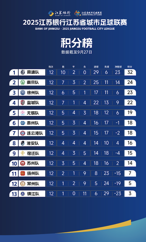 9月27日晚,江苏省城市足球超级联赛(以下简称“苏超”)13轮常规赛全部结束,晋级季后赛的八强球队出炉,连云港、淮安搭上末班车。宿迁队客场输给南京队,倒在终点线前,无缘季后赛。南通队以10胜2平的不败战绩,成为常规赛“冠军”。