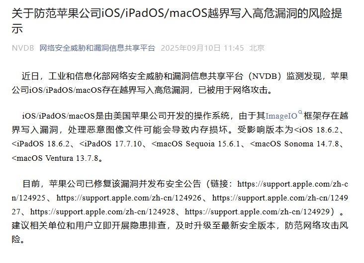 财联社9月10日讯,据网络安全威胁和漏洞信息共享平台消息, 近日,工业和信息化部网络安全威胁和漏洞信息共享平台(NVDB)监测发现,苹果公司iOS/iPadOS/macOS存在越界写入高危漏洞,已被用于网络攻击。