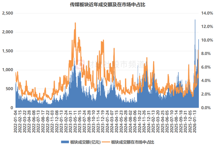 注:传媒板块近年成交额及在市场中占比(截至2月10日收盘)