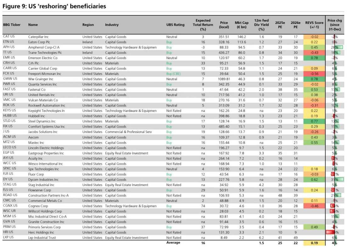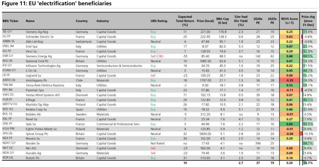 美国回岸和电气化是瑞银最看好的主题。瑞银重点介绍了美国回岸主题的受益者以及欧洲受当前“电气化”这一重大趋势影响的公司。瑞银还表明,这些主题在 REVS 框架中得分也名列前茅。瑞银指出,获“买入”评级的受益者包括伊顿(ETN.US)、Trane技术(TT.US)、Steel Dynamics(STLD.US)、江森自控(JCI.US)、Mastec(MTZ.US)、福陆(FLR.US)、Primoris(PRIM.US)、西门子(SIEGY.US)和Schneider Eletric(SBGSY.US)。