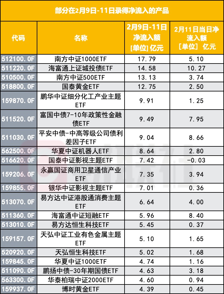 如果把镜头拉近到不同品类,可以看到另一幅截然不同的画面:大盘宽基被集中赎回,中小市值指数、债券与黄金却在一边悄悄吸金,成长风格与科技主题在2月11日再度放量回暖。