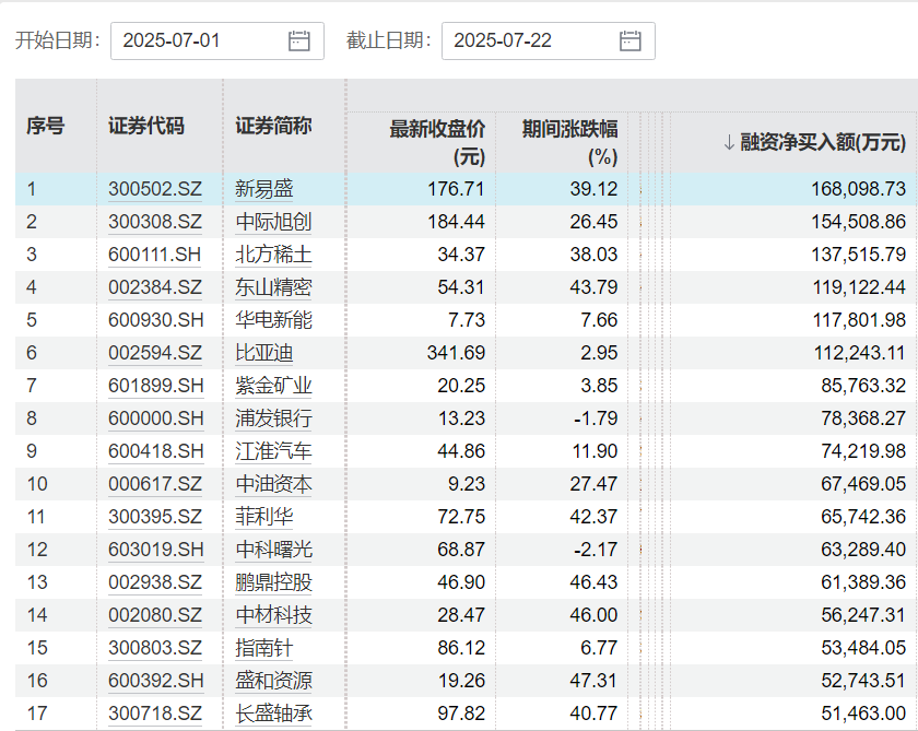 个股方面,新易盛(300502.SZ)、中际旭创等6只个股,7月获融资净买入超10亿元。其中,新易盛融资净买入额为16.81亿元,中际旭创、北方稀土(600111.SH)分别达到15.45亿元和13.75亿元。其余3股7月的融资净买入额也超10亿元,为东山精密(002384.SZ)、华电新能(600930.SH)和比亚迪。